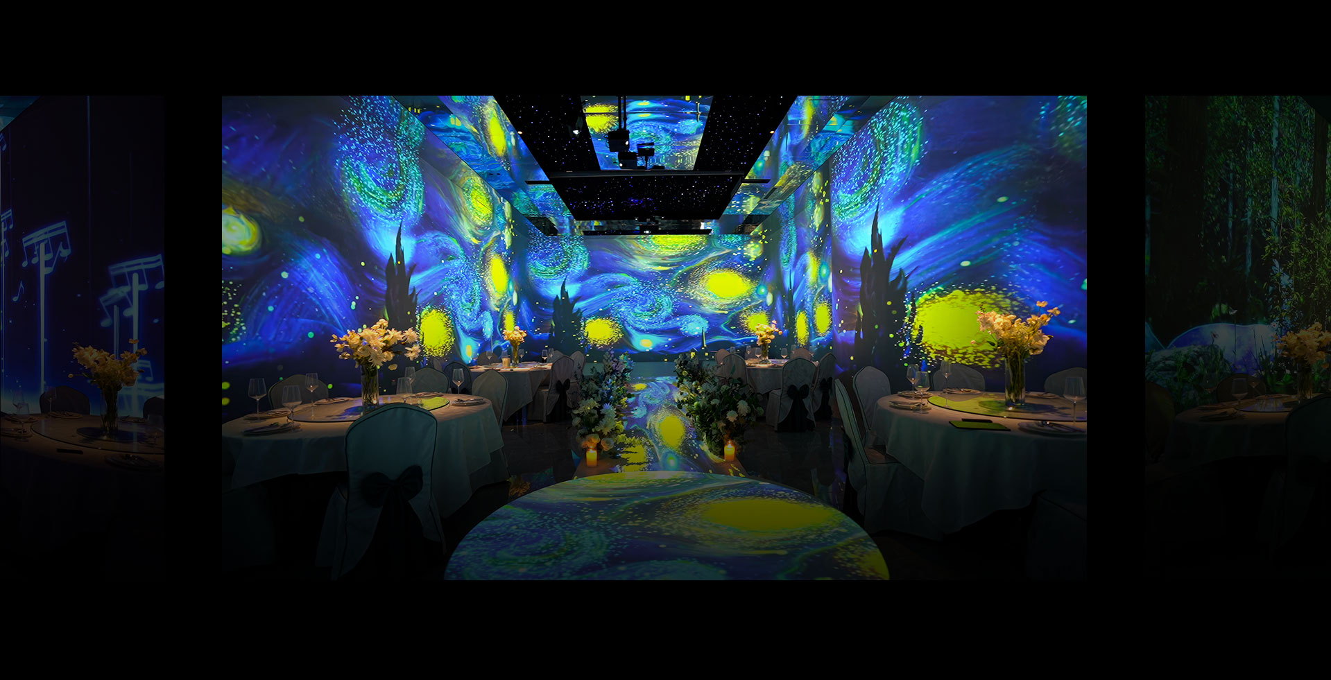 通过5D投影技术,以声、光、电及智能交互手段,专注于打造“沉浸式5D光影餐厅”和“5D全息光影宴会厅”。