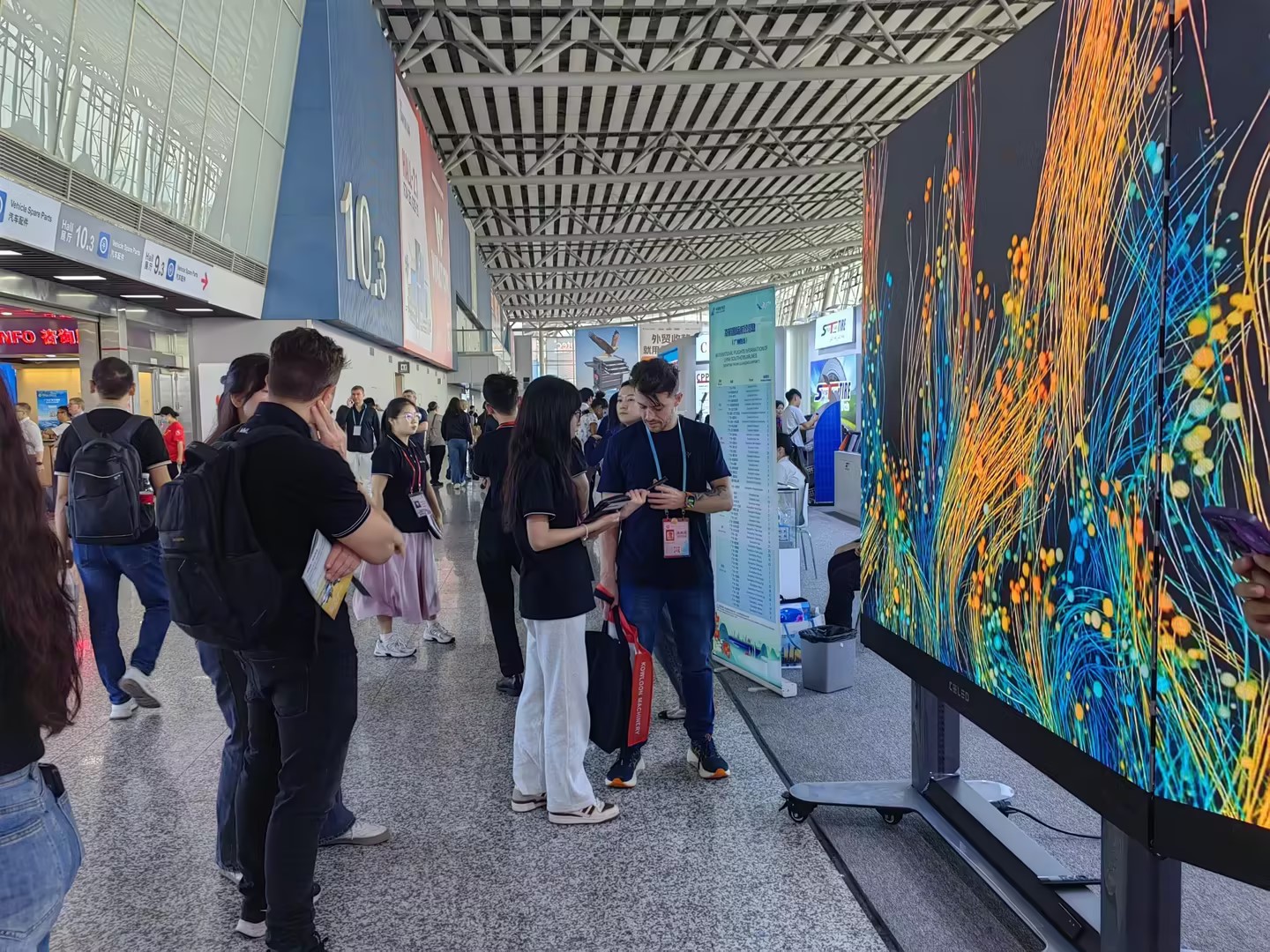 位于10.3馆入口处的多宝电竞主展位上,多宝电竞携带的全球首款向后折叠升降一体机F-Board B系列尤为吸睛,打破了LED显示市场折叠技术的极限,攻克LED大屏折叠铰链全球难题,全球首创的折叠升降功能大幅度减少产品体积,彻底改变设计形态,集美学与实用于一身;高清高刷的显示特点结合数字内容播映,展现出细腻的画面效果和色彩还原度,为各样高精度显示场景所研发,吸引众多行业专家驻足问询。